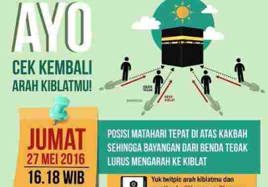 JAKARTA (kabarkota.com) – Kementerian Agama (Kemenag) RI mengimbau masyarakat muslim agak memperbaiki kembali arah kiblatnya, pada Jumat (27/5/2016) sore. Mengingat, pada pukul 16.18 WIB besok, matahari melintasi tepat di atas ka’bah sehingga bayang-bayang suatu benda akan berdiri tegak lurus mengarah kiblat, dimanapun posisinya.