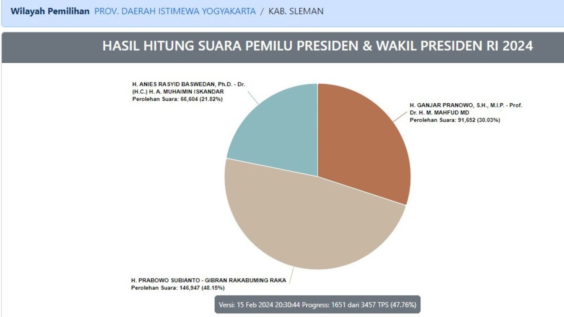 Sementara itu, berdasarkan Hasil Hitung Suara Pemilu Presiden dan Wakil Presiden yang dilansir dari laman Pemilu2024.kpu.go.id yang diakses pada 15 Februari 2024 pukul 20:30 WIB, dari 1.651 TPS di Sleman (47,76 persen) data yang masuk, perolehan suara Paslon 02, Prabowo – Gibran unggul di Kabupaten Sleman, DIY, dengan perolehan suara 146.947 (48,15 persen) dibandingkan Paslon 03, Ganjar – Mahfud dengan perolehan suara 91.652 (30,03 persen) dan Paslon 01, Anies – Muhaimin dengan perolehan 66.604 suara (21,82 persen. (Rep-01)
