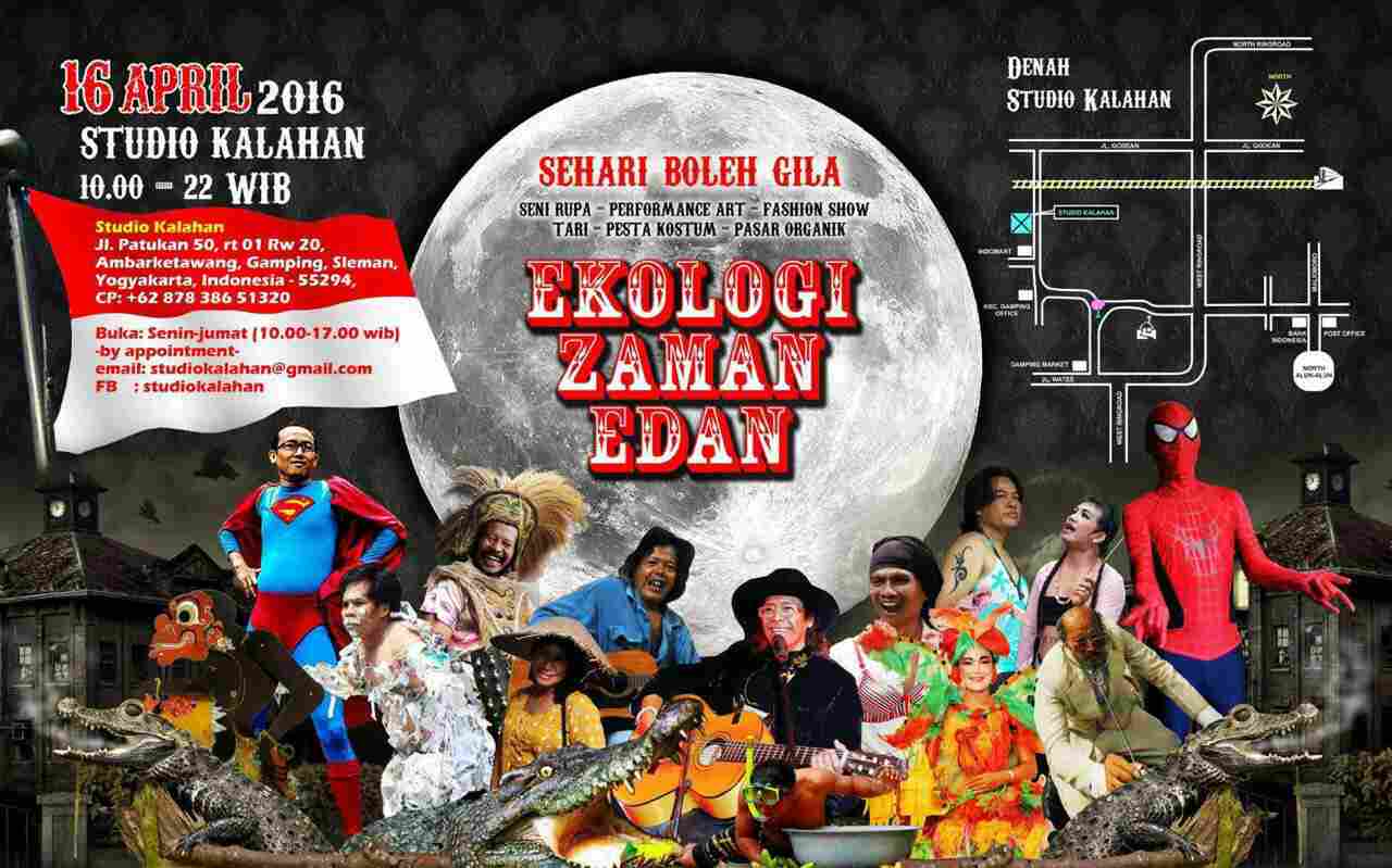 4. Sehari Boleh Gila: Ekologi Zaman Edan, Sabtu (16/4/2016), pukul 10.00 – 22.00 WIB, di Studio Kalahan, Jalan Patukan 50, RT 01/RW 20, AmbarketawangN Gamping, Sleman, CP: 0878 386 513 20
