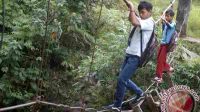 Ilustrasi: Dua pelajar meniti kawat baja penghubung jembatan gantung yang …