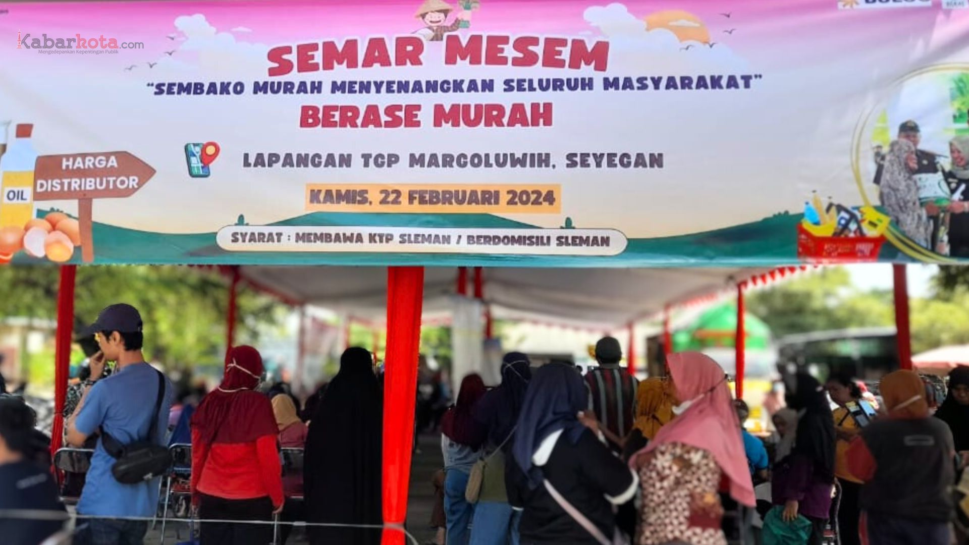 SLEMAN (kabarkota.com) – Ratusan orang yang mayoritas ibu-ibu mengantre di bawah tenda merah putih berukuran besar untuk mendapatkan sembako dengan harga murah yang digelar Pemerintah Kabupaten (Pemkab) Sleman, melalui program Sembako Murah Menyenangkan Seluruh Masyarakat (Semar Mesem), di halaman Lapangan TGP, Kalurahan Margoluwih, Kapanewon, Seyegan, pada Kamis (22/2/2024).