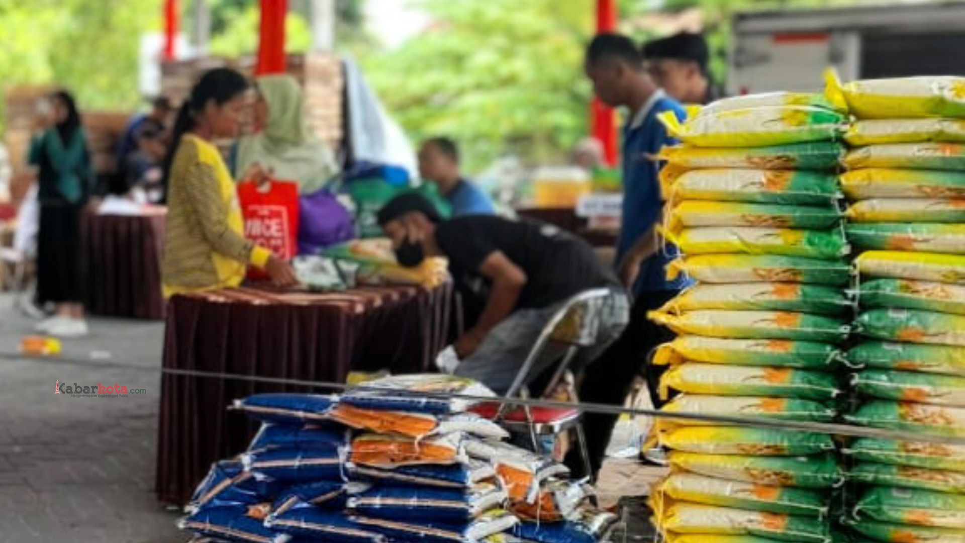 Beras yang dijual dengan harga murah oleh Disperindag Kabupaten Sleman melalui program Semar Mesem di halaman lapangan TGP, Kalurahan Margoluwih, Kapanewon Seyegan, pada Kamis (22/2/2024). (dok. kabarkota.com)