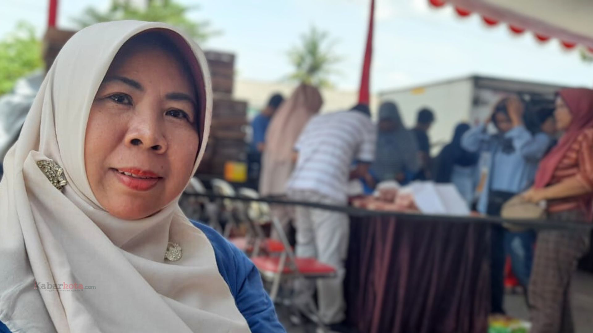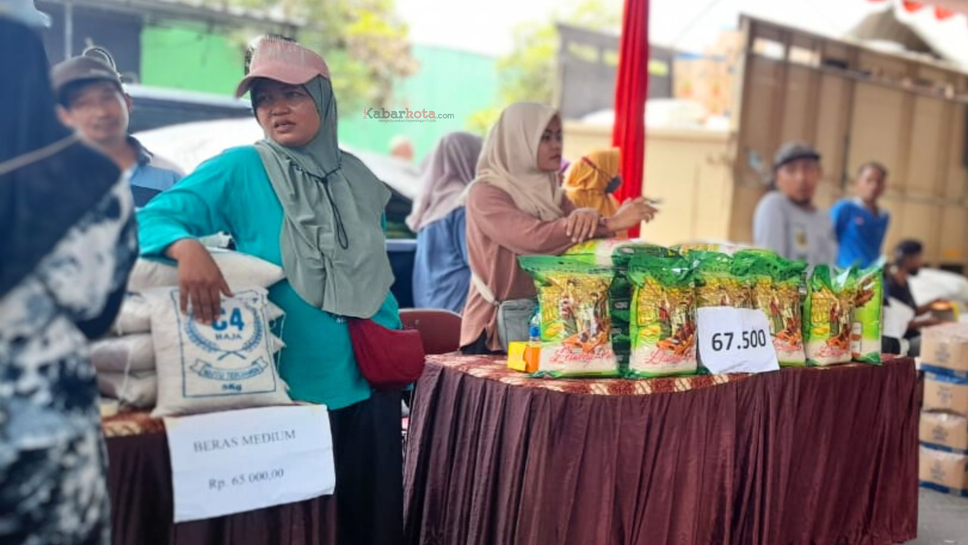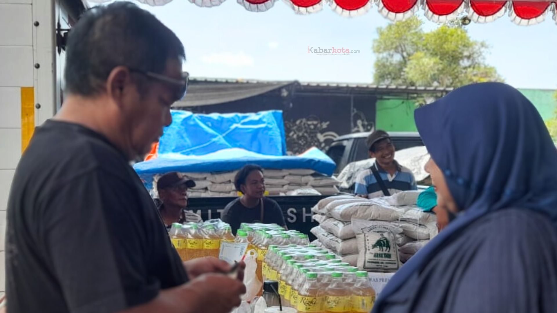 Di sudut lain, ujung utara tenda, seseorang yang memegang mic sibuk memanggil orang-orang, sesuai nomor antrean mereka untuk maju dan berbelanja bahan pangan, seperti beras, telur, tepung terigu, gula pasir maupun minyak goreng dengan harga khusus.