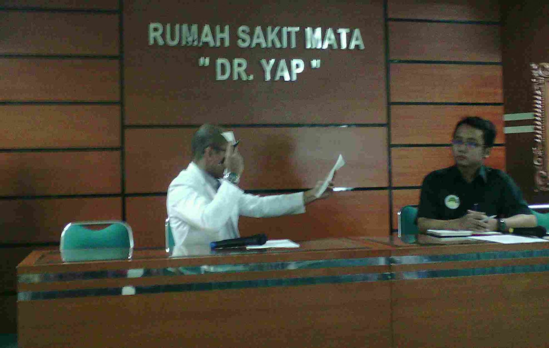 Dokter spesialis mata sub spesialis retina RS Mata dr Yap Yogyakarta, Muhammad Bayu Sasongko (kiri) memprakrekkan penggunaam kertaa putih untuk menyaksikan gerhana matahari, di RS Mata dr Yap Yogyakarta, Senin. (7/3/2016). (sutriyati/kabarkota.com)