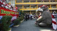 Ilustrasi : Seekor gajah berbaju Santa Claus menghibur pengunjung di …