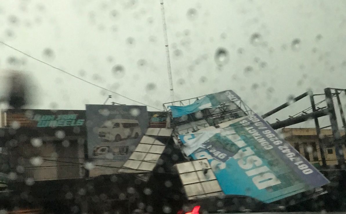 Ilustrasi: sebuah baliho roboh akibat ditempa angin kencang dan hujan lebat di wilayah Sleman, Jumat (17/3/2023). (dok. twitter @trcbpbddiy)