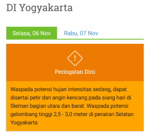 Masyarakat juga diminta waspada terhadap kemungkinan hujan disertai angin yang dapat menyebabkan pohon maupun baliho tumbang atay roboh, serta peningkatan kecepatan angin dan ketinggian gelombang laut terutama bagi nelayan dan wisatawan di sepanjang pantai selatan DIY.