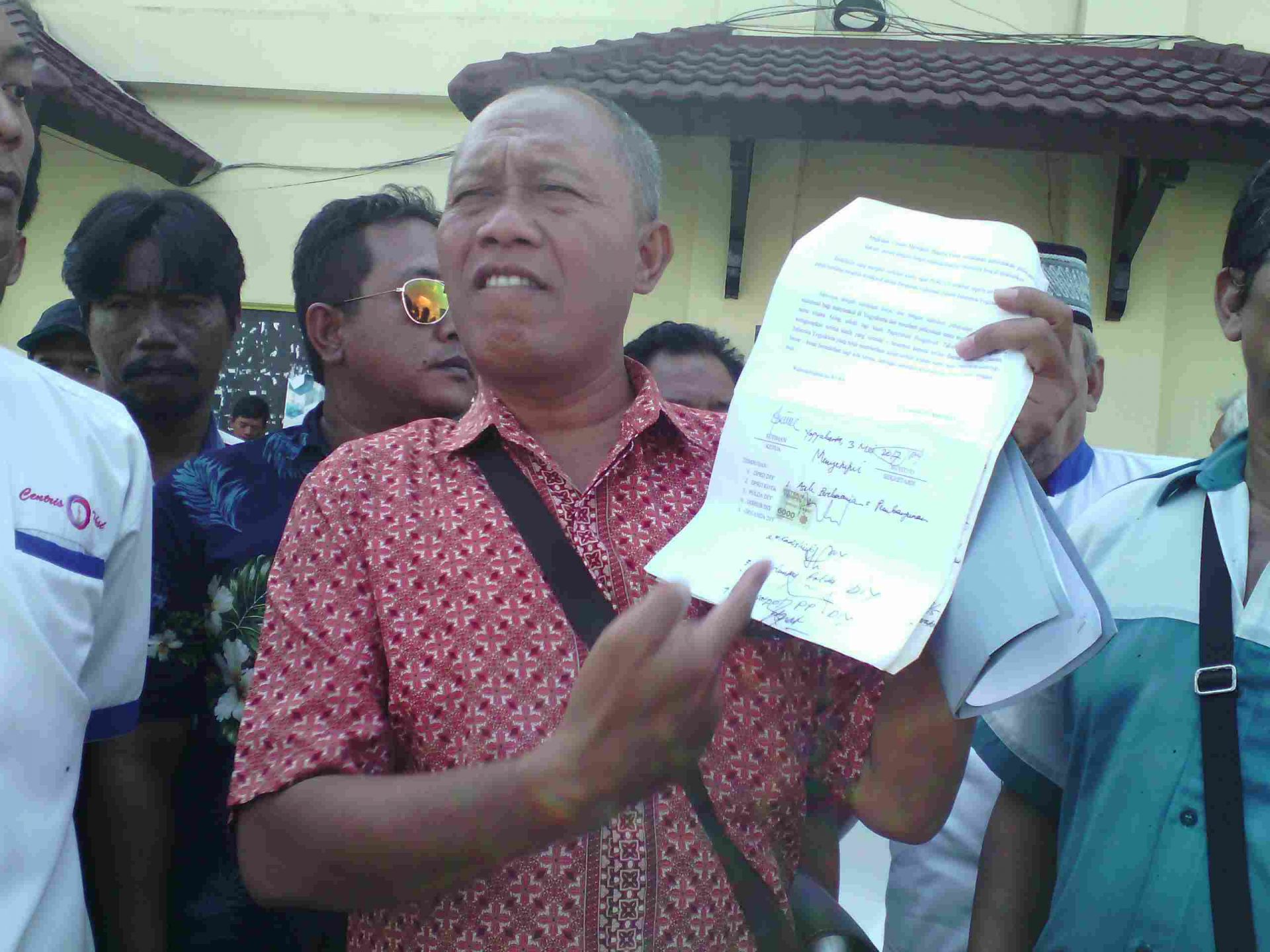 Ketua Kopetayo, Sutiman menunjukkan bukti tanda tangan keempat pejabat sebagai bentuk kesepakatan bersama dalam audiensi di kompleks Kepatihan Yogyakarta, 3 Mei 2017 lalu. Bukti tersebut ditunjukkan Sutiman kepada wartawan di Mapolda DIY, Senin (5/6/2017). (sutriyati/kabarkota.com)