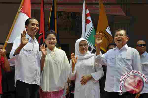 Presiden Terpilih Joko Widodo (kiri) dan Wakil Presiden Terpilih Jusuf Kalla (kanan) dengan didampingi istri mereka.(Sumber Foto: Antara)