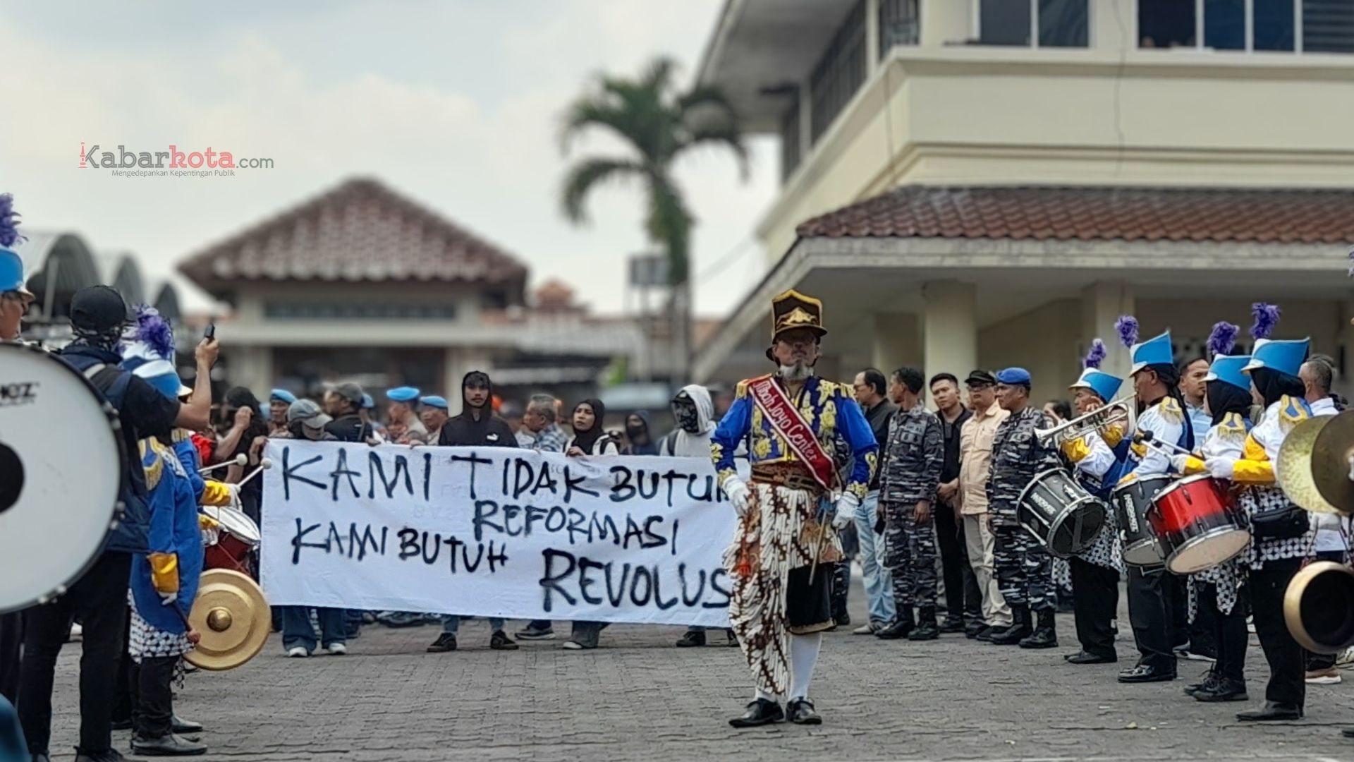 Beberapa menit kemudian, pasukan drumband dengan berbusana layaknya bregada prajurit keraton Yogyakarta melakukan pertunjukkan seni guna ‘menyambut’ para demonstran. Bahkan ketika Koordinator Lapangan (Korlap) Aliansi Jogja Bergerak, Ain mulai berorasi, drumband kembali dibunyikan.