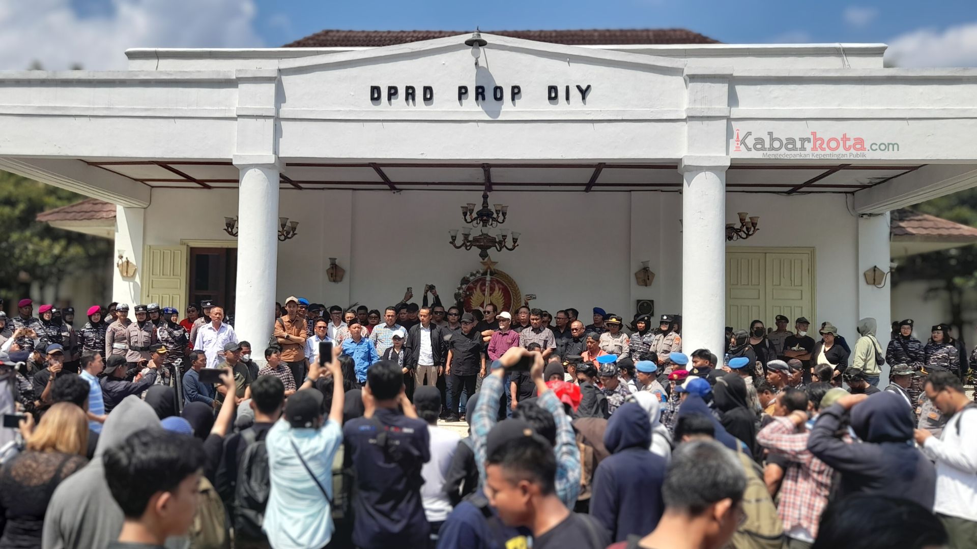 Massa aksi kemudian bergerak menuju depan lobi DPRD DIY untuk melakukan orasi-orasi di tengah pengawalan ketat TNI/Polri. Di situ, puluhan anggota dewan juga berdiri di teras gedung untuk mendengarkan aspirasi para mahasiswa.
