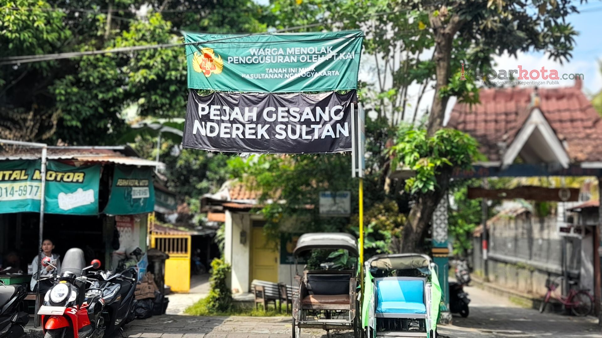 YOGYAKARTA (kabarkota.com) – Spanduk bertuliskan “Warga Menolak Penggusuran oleh PT KAI. Tanah Ini Milik Kasultanan Ngayogyakarta” dengan berlatarbelakang hijau dan simbol keraton Yogyakarta terbentang di depan sebuah rumah dinas PT KAI Kawasan Stasiun Lempuyangan Yogyakarta.