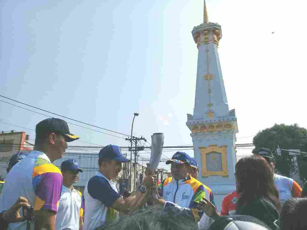 Penyerahan obor api Asian Games XVIII 2018 kepada Walikota Yogyakarta, Haryadi Suyuti, di Tugu Pal Putih, Kamis (19/7/2018). (sutriyati/kabarkota.com)