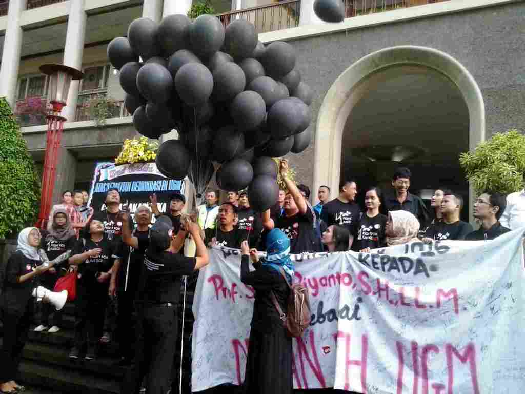 SLEMAN (kabarkota.com)- Karangan bunga bertuliskan duka cita, balon warna hitam, dan baju warna hitam bertuliskan “fight for justice 65%”, dijadikan tanda matinya demokrasi di Universitas Gajah Mada (UGM)(15/9/2016). Dalam aksi yang digelar di Balairung UGM, dosen dan mahasiswa Fakultas Hukum (FH) menyatakan sikap menolak atas praktik anti-demokrasi dalam pemilihan dekan.