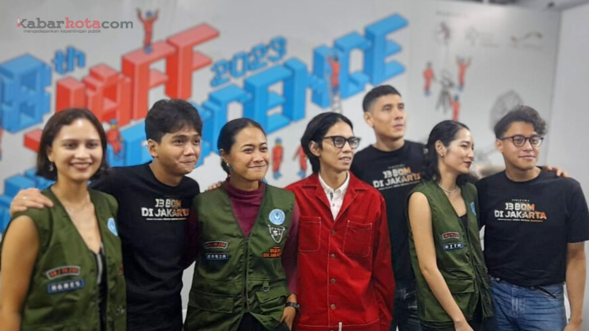 Sutradara (baju merah) dan para pemain film 13 Bom di Jakarta usai konferensi pers di Yogyakarta, pada 2 Desember 2023 (dok. kabarkota.com)