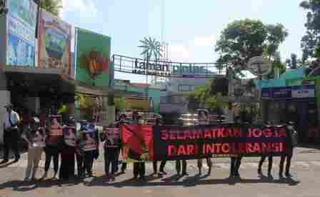 Massa aksi membentangkan spanduk “Selamatkan Jogja dari Intoleransi” di depan Grha Saba Pramana UGM Yogyakarta, Selasa (10/5/2016) (Foto: LBH Jogja)Selain membawa poster bertuliskan “Pecat Kompol Sigit Haryadi”, massa aksi juga membawa spanduk “Selamatkan Jogja dari Intoleransi.”