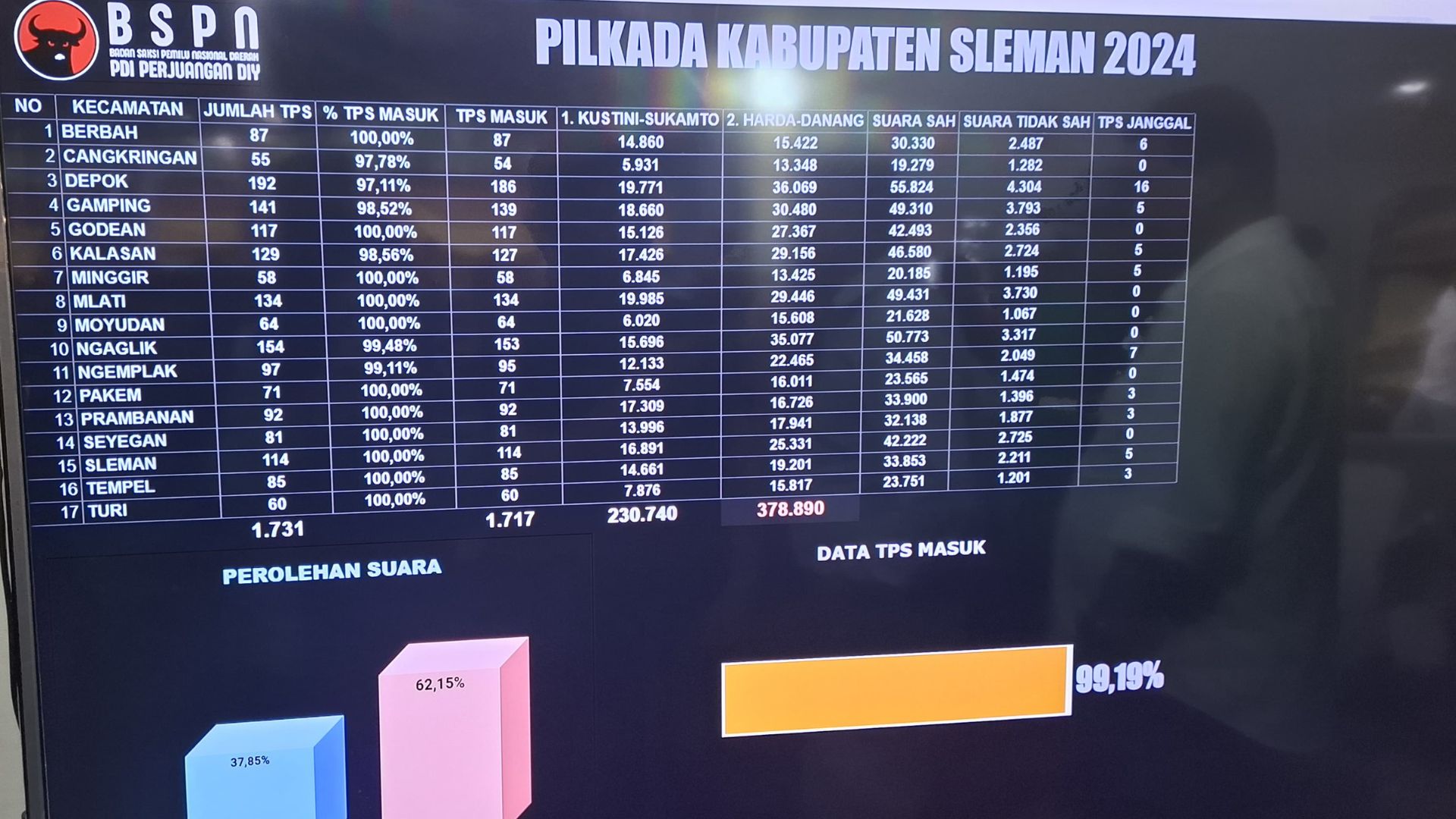 Berdasarkan rekapitulasi hasil quick count Badan Saksi Pemilu Nasional (BSPN) Daerah PDIP DIY, per 27 November 2024, sekitar pukul 17.00 WIB, Paslon nomor urut 01, Kustini – Kamto mendapatkan suara 230.740 (37,85 persen). Sedangkan Paslon nomor urut 02, Harda -Danang mendapatkan 378.890 suara (62,15 persen) yang tersebar di 1.717 TPS (99,19 persen).