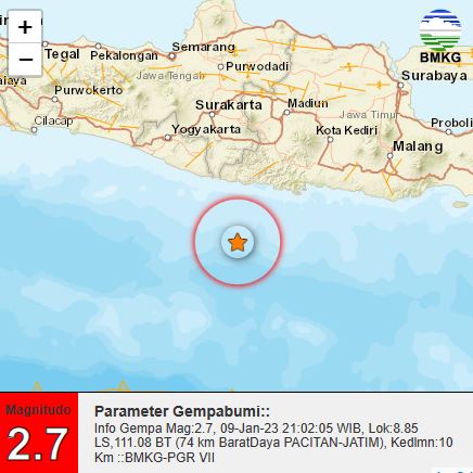 Pusat gempa Pacitan yang terjadi pada Senin (9/1/2023) malam.(dok. BMKG)