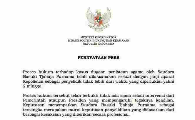 Dalam siaran persnya, Wiranto menyebutkan bahwa proses hukum terhadap kasus dugaan penistaan agama oleh Ahok telah dilaksanakan sesuai dengan janji aparat Kepolisian sebagai penyelidik tidak lebih dari waktu yang diperlukan yakni 2 minggu.
