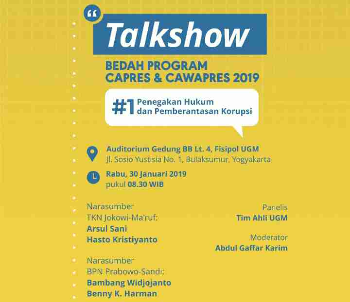 Rencananya talkshow tak hanya akan digelar sekali saja, melainkan beberapa kali dalam waktu yang berbeda. Yakni, Tanggal 30 Januari 2019 tentang Penegakan Hukum dan Pemberantasan Korupsi; tanggal 20 Februari 2019 tentang Ketahanan Pangan dan Energi; tanggal 6 Maret 2019 tentang Politik Luar Negeri Indonesia; tanggal 27 Maret 2019 tentang Hak Dasar WN dan Kesejahteraan Sosial; dan pada 4 April 2019 mendatang, tentang Infrastruktur, Daerah Tertinggal dan Pemerataan Pembangunan. Seluruh rangkaian talkshow tersebut akan berlangsung di Auditorium Fisipol UGM Gedung BB Lt 4 Jl. Sosio Yustisia No 1 Bulaksumur Yogyakarta. (Ed-02)
