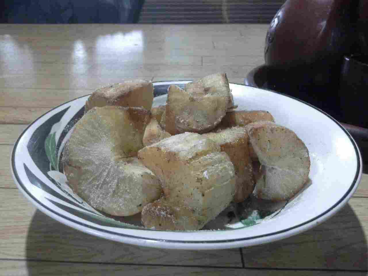 Singkong goreng yang disajikan dengan penyedap rasa yang terbuat dari jamur tiram di Warung Lego Roso, Sleman. (Ahmad Mustaqim/kabarkota.com)