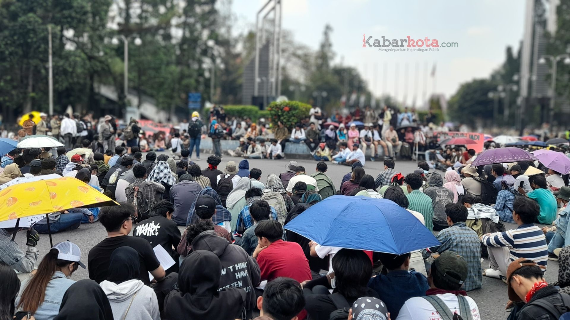 Mereka duduk di atas aspal yang menyengat di tengah terik matahari. Beberapa terlihat membawa payung untuk melindungi diri dari panas matahari