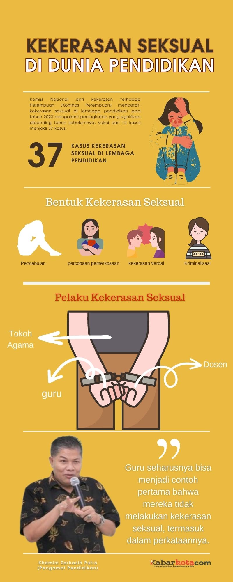 Namun, Pada 2 Mei 2023 lalu Komisi Nasional anti kekerasan terhadap Perempuan (Komnas Perempuan) merilis, pada tahun 2023 tercatat ada 37 kasus kekerasan seksual di lembaga pendidikan. Jumlah tersebut meningkat dibandingkan tahun sebelumnya, yang angkanya masih 12 kasus. Bahkan, guru, dosen, dan tokoh agama yang berkiprah di dunia pendidikan turut menjadi pelaku kekerasan.