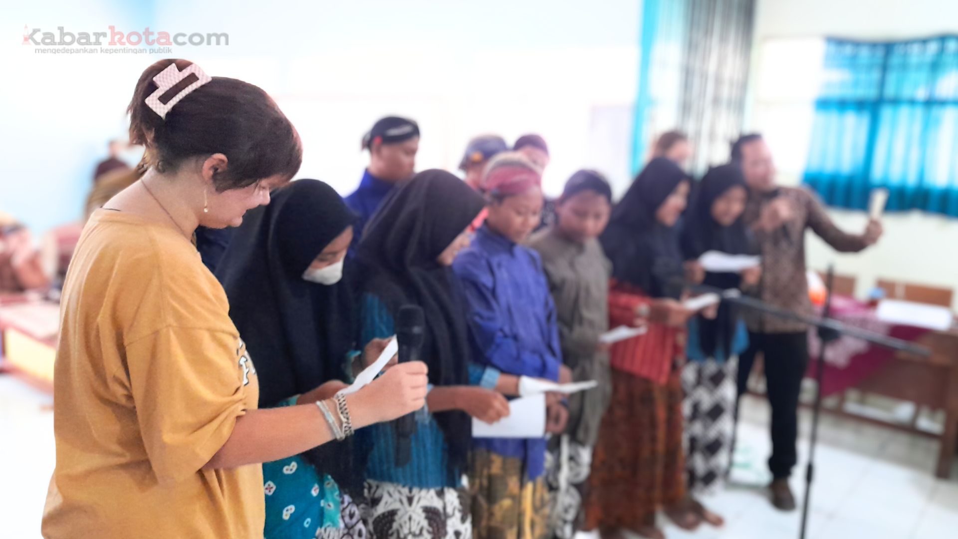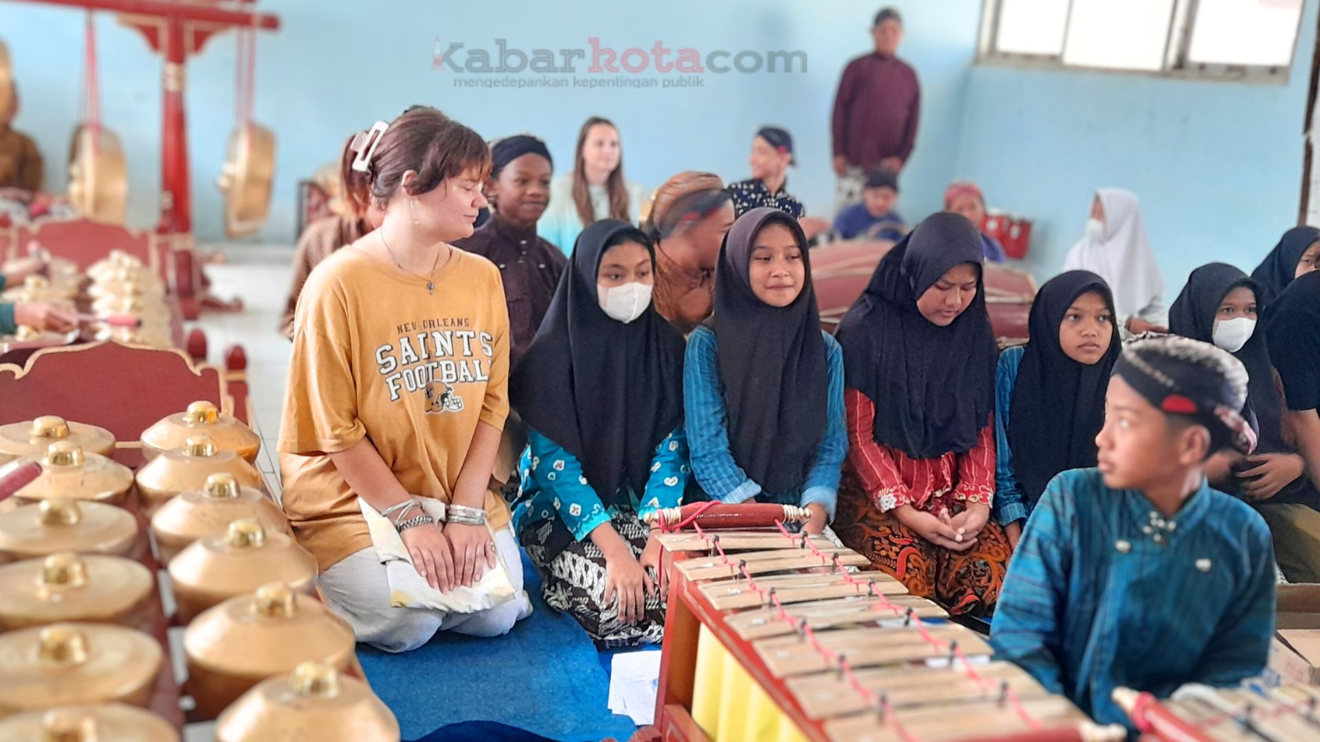 Suasana saat mahasiswa asing berbaur dengan siswa SMP Bina Muda Gunungkidul saat memainkan gamelan (dok. kabarkota.com)