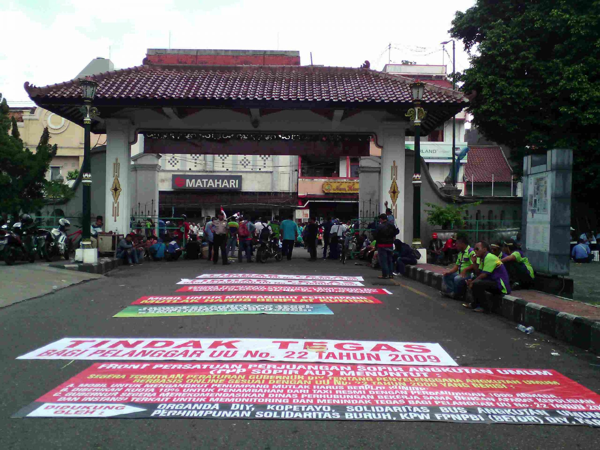 Spanduk penolakan Komunitas Pengemudi Taksi DIY terhadap keberadaan angkutan umum online, di kompleks kepatihan Yogyakarta, Rabu (3/5/2017). (sutriyati/kabarkota.com)
