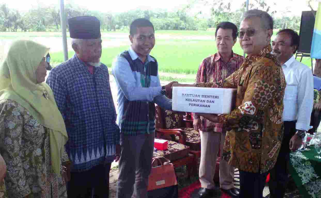 Dirjen Penguatan Daya Saing Produk Kelautan dan Perikanan Kementerian Kelautan dan Perikanan (KKP), Nilanto Prabowo (kanan) menyerahkan bantuan ikan konsumsi secara simbolik. (sutriyati/kabarkota.com)