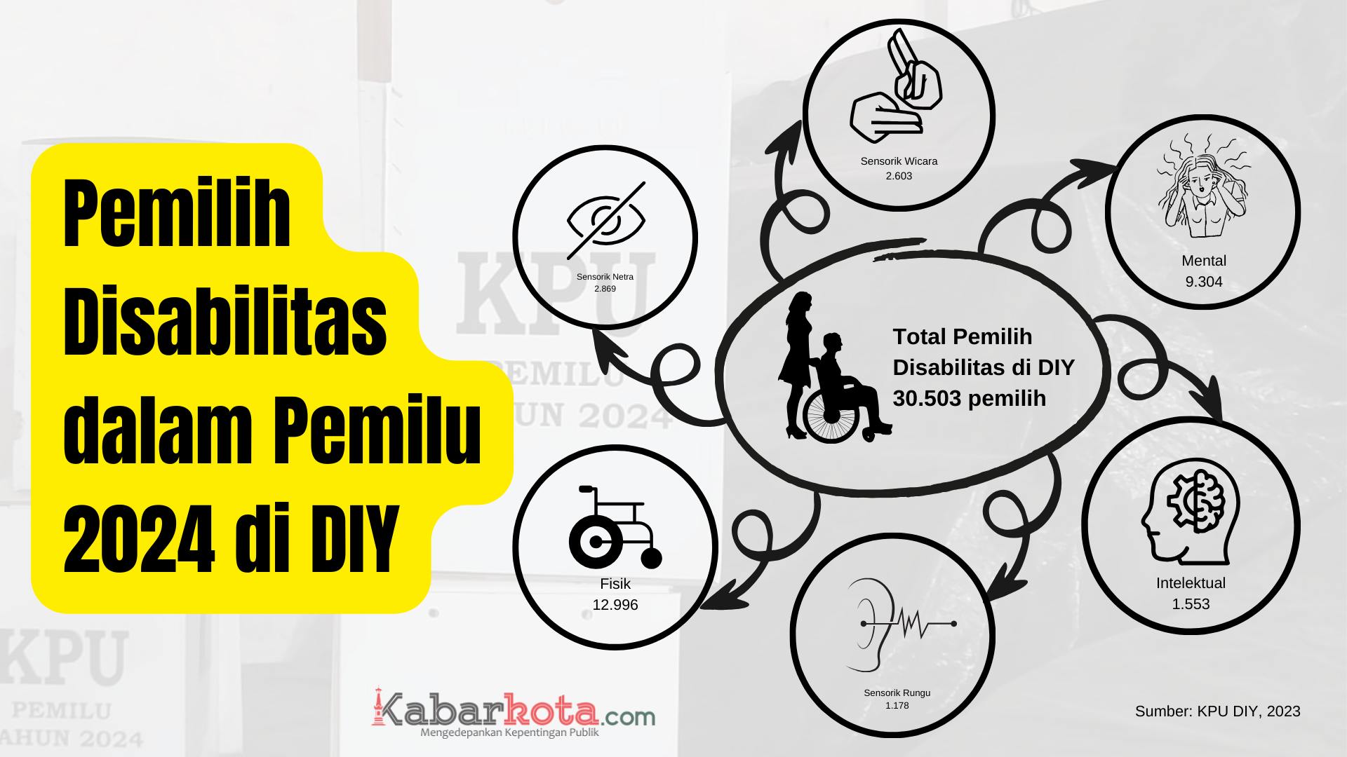 Berdasarkan rekapitulasi jumlah pemilih disabilitas pada Daftar Pemilih Tetap (DPT) Pemilu 2024 di DIY, total pemilih disabilitas sebanyak 30.503 pemilih dengan beragam jenis disabilitas. (Rep-01)