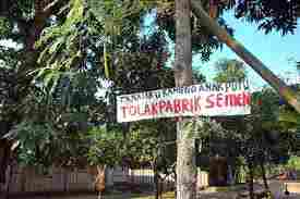 Ilustrasi: papan penolakan warga atas pembangunan pabrik semen di Rembang (sumber: rembang.org)