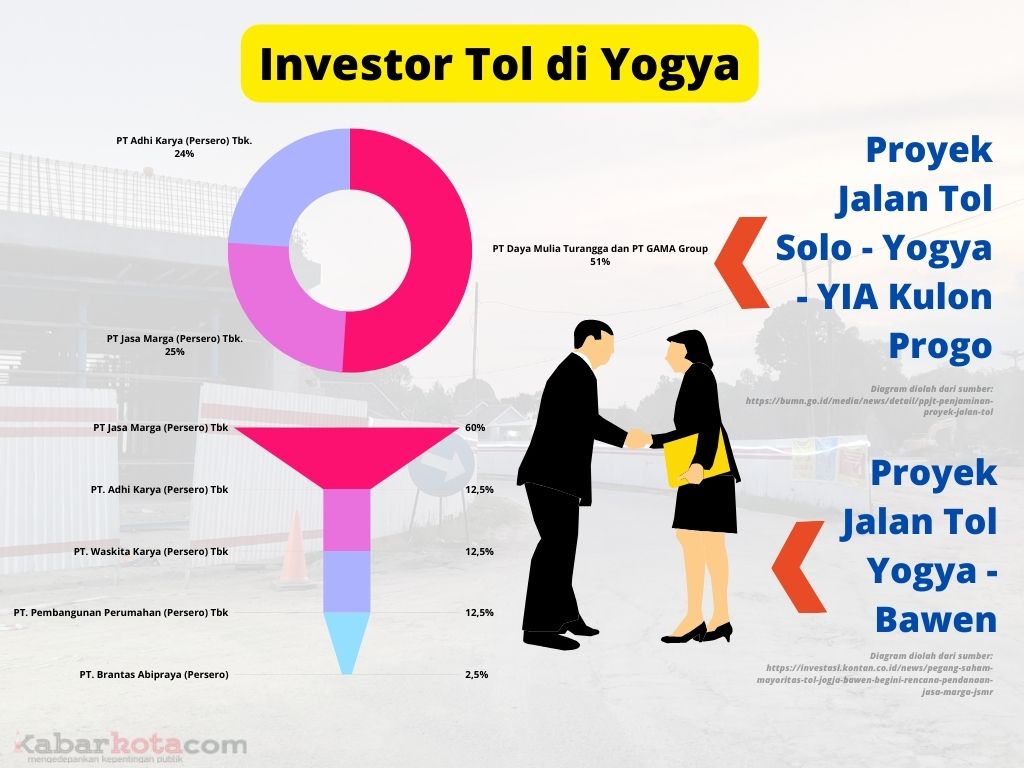 Merujuk pada data PT Jasa Marga (Persero) Tbk., kepemilikan saham PT Daya Mulia Turangga-PT Gama Group pada proyek jalan tol Solo – Yogya – YIA sebesar 51 persen. Sedangkan PT Jasa Marga (Persero) Tbk. sebesar 25 persen, dan PT Adhi Karya (Persero) Tbk. sebesar 24 persen Itu artinya, investor pada proyek tol Solo – Yogya – YIA Kulon Progo mayoritas dikuasai oleh swasta.
