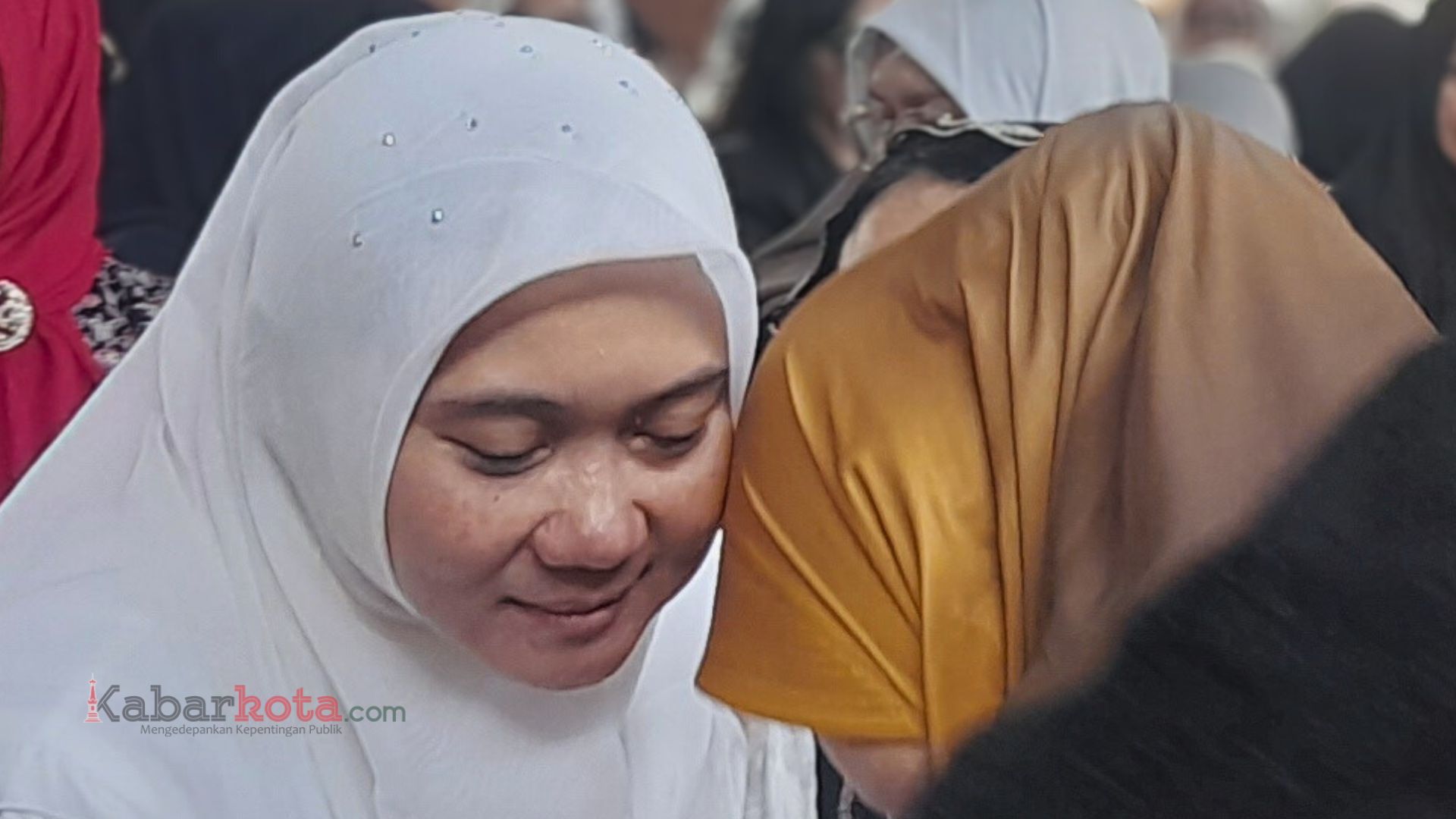 Istri almarhum, Nyai Rindang Farihah yang duduk kursi lipat deretan depan, mengenakan gamis dan jilbab putih. Dari wajahnya terlihat duka mendalam, air matanya sesekali menetes, namun ia masih berusaha tersenyum ketika sebagian para takziyah menghampiri dan memeluknya sebagai bentuk dukungan moral atas kesedihannya kehilangan suami tercinta.