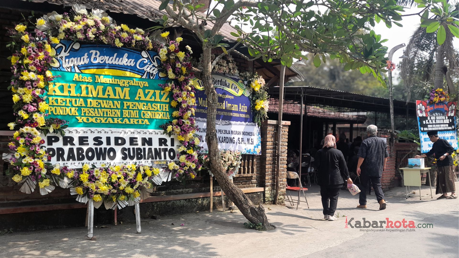 Karangan bunga ucapan duka cita dari banyak pihak, berjajar di sekitar Pondok Pesantren yang beralamat di Padukuhan Gombang, Kalurahan Tirtoadi, Kapanewon Mlati, Kabupaten Sleman, DIY itu. Salah satunya, karangan bunga dari Presiden RI, Prabowo Subianto yang diletakkan di dekat pintu masuk pendopo sisi timur.