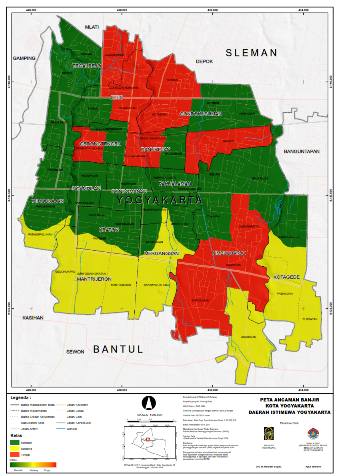 Dari peta ancaman banjir di Kota Yogyakarta, 12 kelurahan yang masuk zona merah, yakni Karangwaru, Cokrodiningratan, Terban, Kotabaru, Gowongan, Pringgokusuman, Tegal Panggung, Suryatmajan, Baciro, Warungboto, Pandeyan, dan Sorosutan.