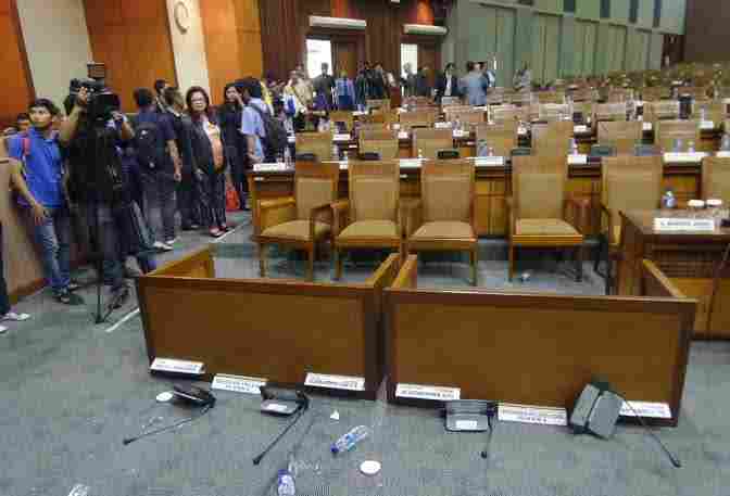 Meja anggota DPR RI di Senayan yang digulingkan, Selasa (28/10). (sumber: rimanews.com)