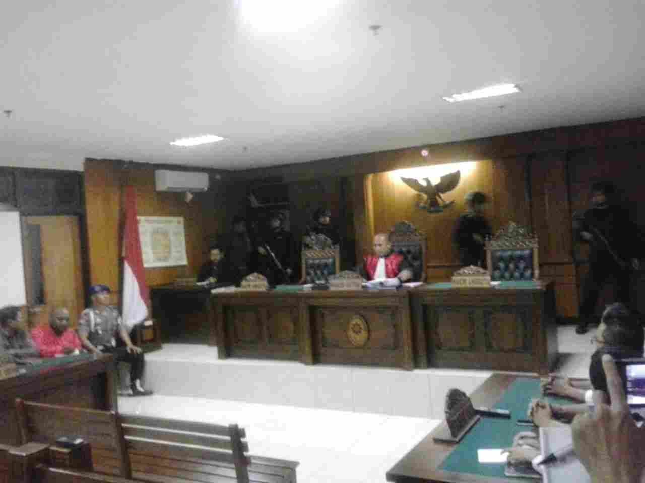 Sebelumnya saat sidang akan dimulai, Gobay menanyakan kepada hakim tentang keberadaan empat personil Brimob yang ada dibelakang hakim. Rajaka menjawab bahwa dirinya tidak tahu menahu tentang peronil Brimob yang berada di belakangnya, kerena tidak ada koordinasi sebelumnya.