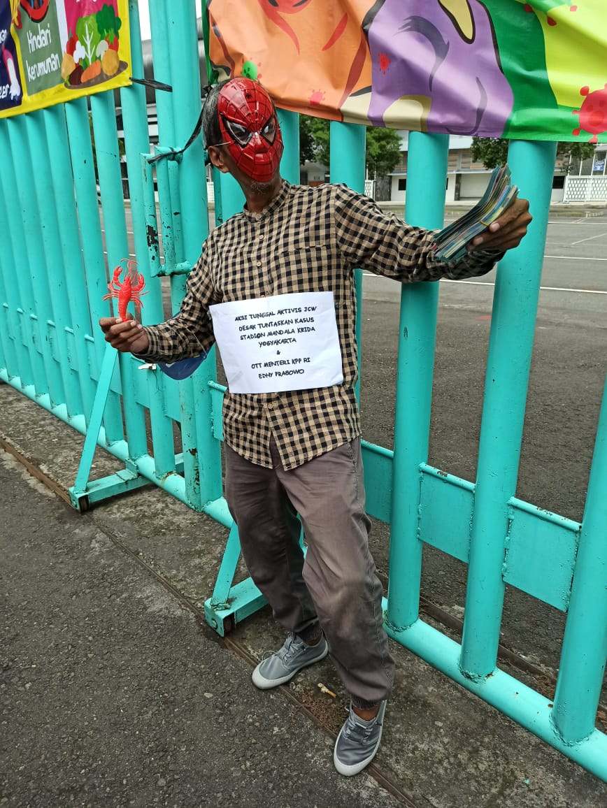 YOGYAKARTA (kabarkota.com) – Seorang lelaki bertopeng spiderman dengan menenteng lobster dan segepok uang mainan berdiri di depan pintu gerbang Stadion Mandala Krida Yogyakarta, Kamis (26/11/2020).