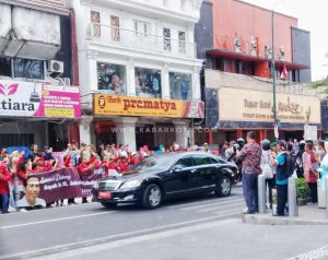 Sementara di sisi utara gedung DPRD DIY atau persis di depan hotel tempat Presiden menghadiri acara, tampak barisan perempuan berseragam merah membentangkan spanduk ucapan selamat datang untuk Presiden, Jokowi.
