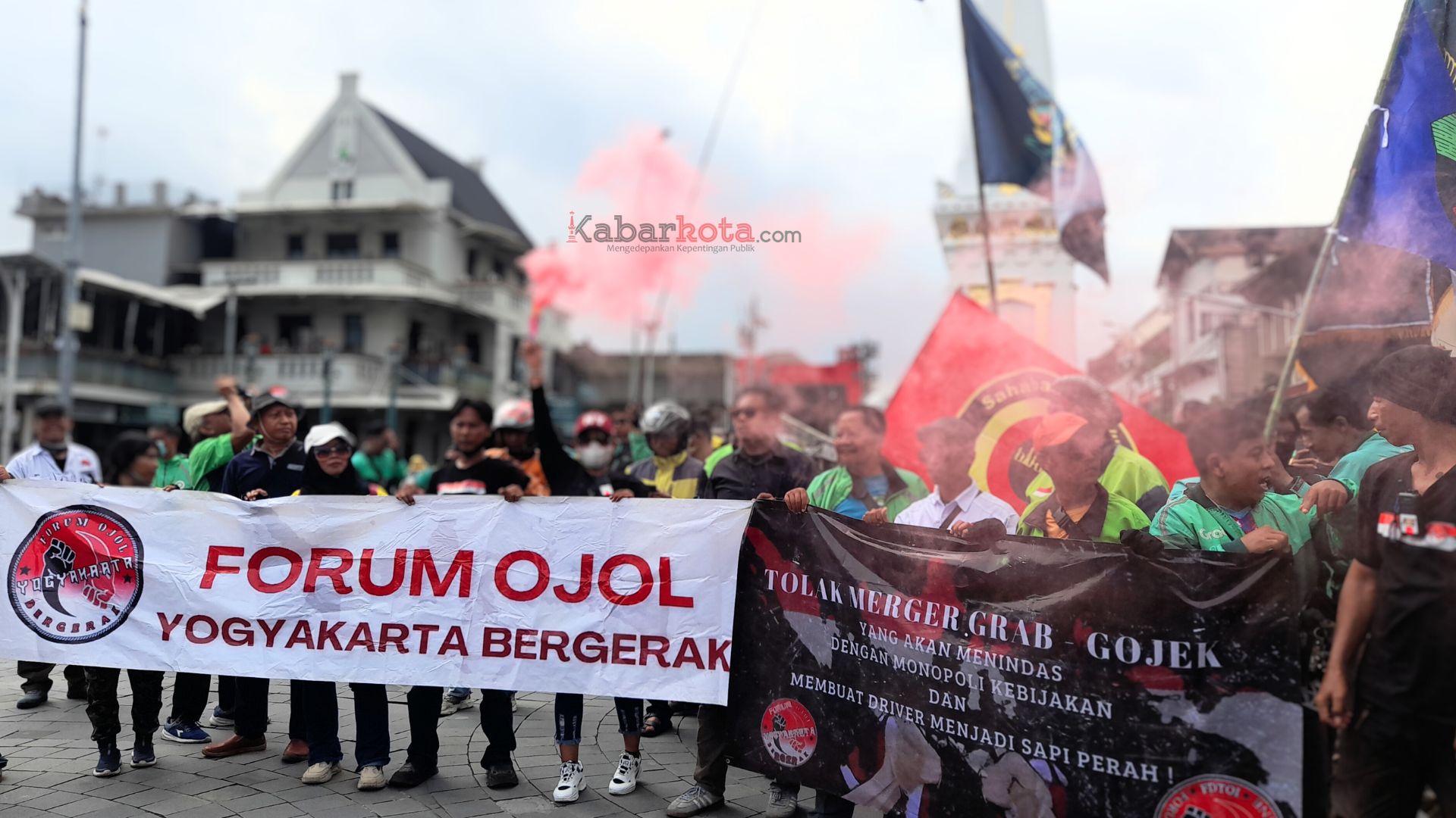 Mereka melakukan orasi dan membentangkan spanduk-spanduk di sekitar Tugu Yogyakarta, setelah sebelumnya berunjuk-rasa di tiga titik kantor Ojol Sleman dan Kota Yogyakarta.