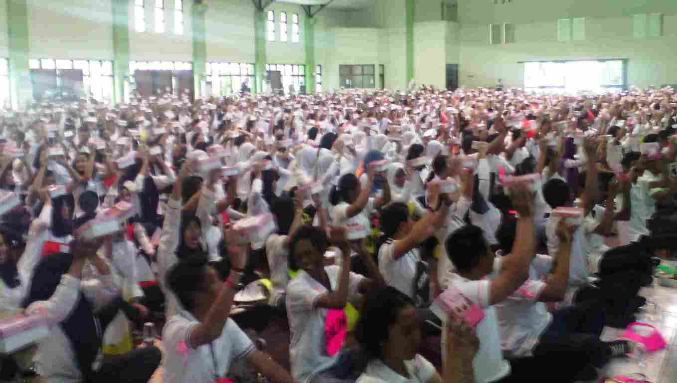 Sekitar seribu mahasiswa baru STIE YKPN mengangkat box nasi gudeg mereka sebelum mendapatkan penghargaan dari Rekor Muri Indonesia, Sabtu (5/9). (sutriyati/kabarkota.com)