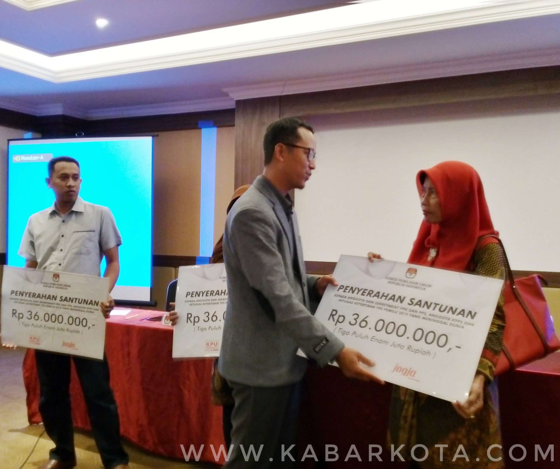 Penyerahan santunan secara simbolik oleh Ketua KPU DIY, Hamdan Kurniawan, pada Minggu (2/6/2019). (kabarkota.com)