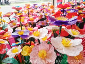 Pada kesempatan ini, pihaknya juga membuka stand pameran produk kerajinan hasil daur ulang limbah plastik. Mulai dari bros, aksesoris, buket bunga warna-warni, hingga tas. Harga yang ditawarkan mulai dari Rp 5 ribu – Rp 200 ribu.
