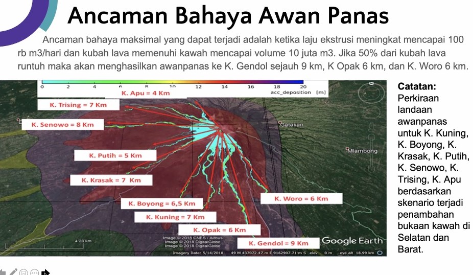 Jka nantinya laju ekstrusi meningkat mencapai 100 ribu meter kubik per hari, dan kubah lava memenuhi kawah mencapai 10 juta meter kubik. Kemudian 50 persen dari kubah tersebut runtuh, maka BPPTKG DIY memperkirakan akan muncul awan panas ke arah Kali (Sungai) Gendol sejauh 9 km, dan Kali Woro 6 km.