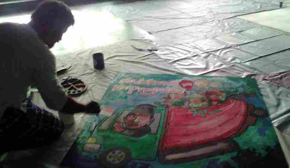 Subki, salah satu peserta asal Magelang misalnya. Dengan mengambil judul judul “No Jokowi, No Progress,” ia menggambarkan Jokowi sebagai Sopir kendaraannya yang penumpangnya masyarakat dari berbagai latar belakang sosial dengan menenteng balon-balon berbendera merah putih.