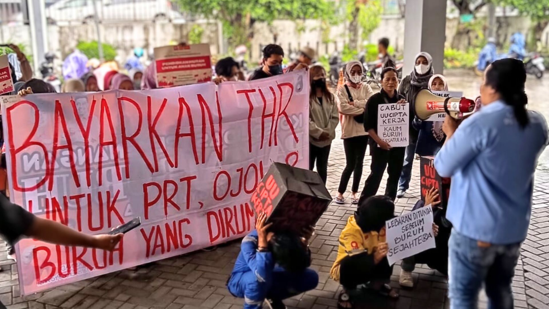 Ilustrasi: Aksi MPBI memperjuangkan THR bagi PRT, pengemudi Ojol dan Kurir, di Kantor Disnakertrans DIY, pada 28 Maret 2024. (dok. istimewa)