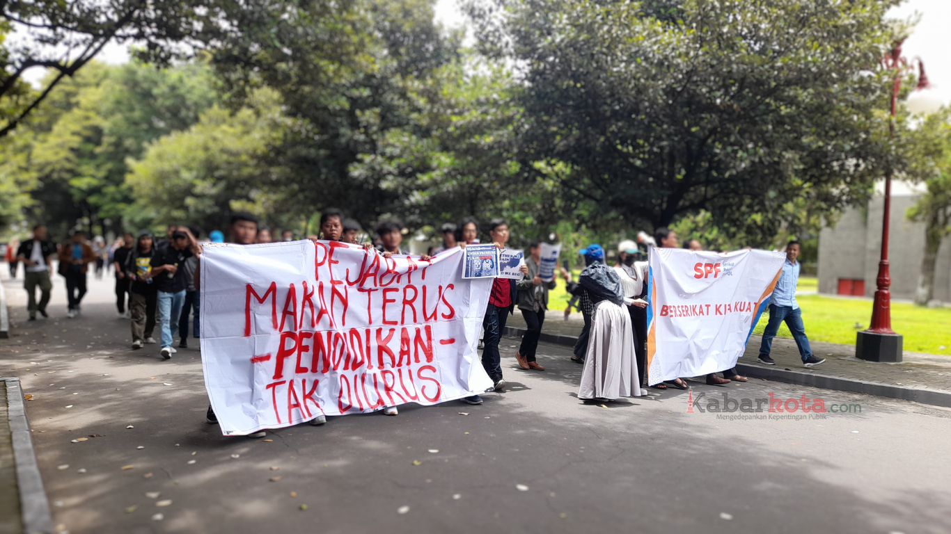 SLEMAN (kabarkota.com) – Ratusan orang dari Serikat Pekerja Fisipol (SPF) UGM, Aliansi Dosen ASN Kemendiktisaintek Seluruh Indonesia (Adaksi) dan Dewan Mahasiswa (Dema) bergerak bersama dari Fakultas Ilmu Sosial dan Politik (Fisipol) UGM ke Balairung dengan long march, sembari membentangkan dua spanduk besar di barisan depan dan disusul dengan barisan pembawa poster-poster kecil di belakangnya.