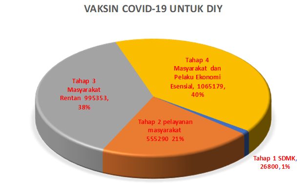 Ketua Harian Gugus Tugas Penanganan Covid-19 Kota Yogyakarta, Heroe Poerwadi memaparkan, pada distribusi tahap pertama, Kota Yogyakarta mendapatkan jatah 19.620 dosis untuk 9.810 nakes. Tahap pertama sebanyak 9.810 dosis. Sedangkan sisanya untuk tahap kedua akan dikirim pada akhir bulan Januari ini.