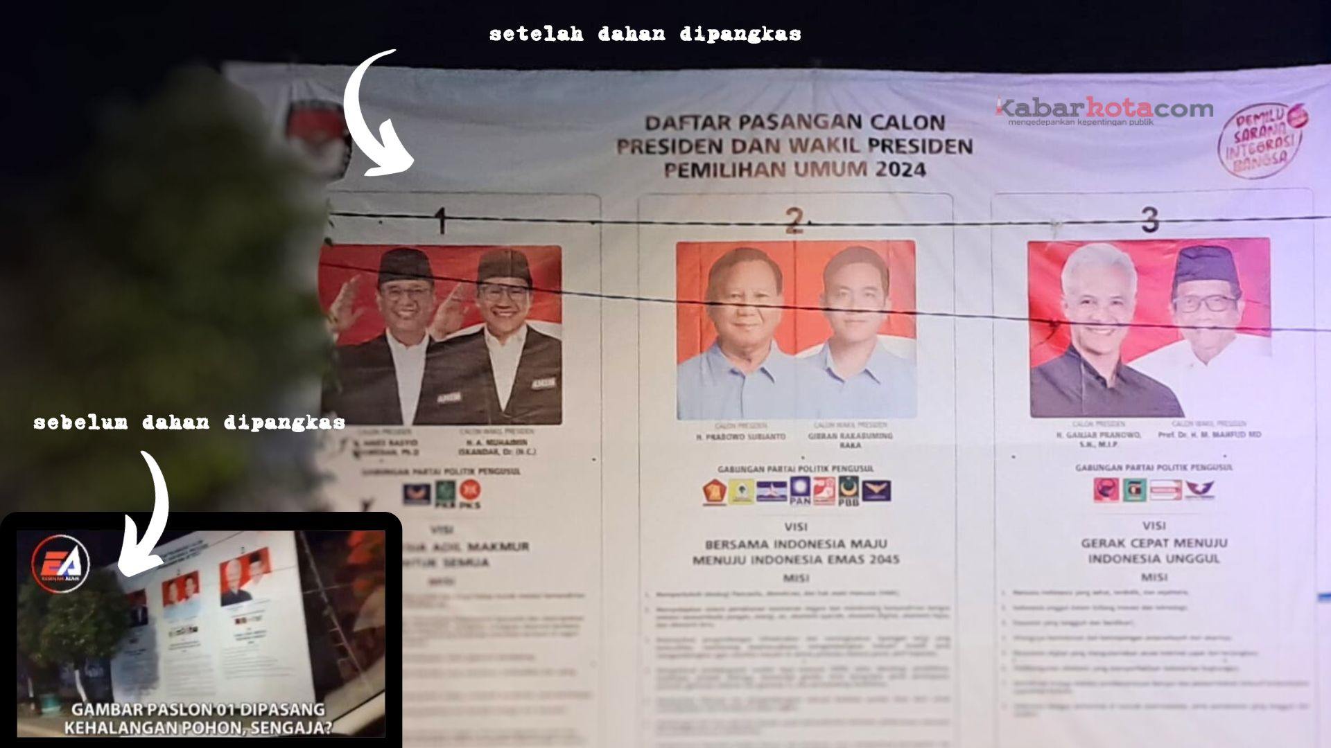 Dalam video Essenah Alam tentang pemasangan APS Paslon Capres di Kridosono Yogyakarta yang diunggah oleh akun @Yurissa_Samosir pada 20 Desember 2023, pukul 19.55 WIB yang dibubuhi narasi Gimana “Menurut Kalian? Gambar Paslon 01 dipasang kehalangan pohon di Jogja, sengaja?”.